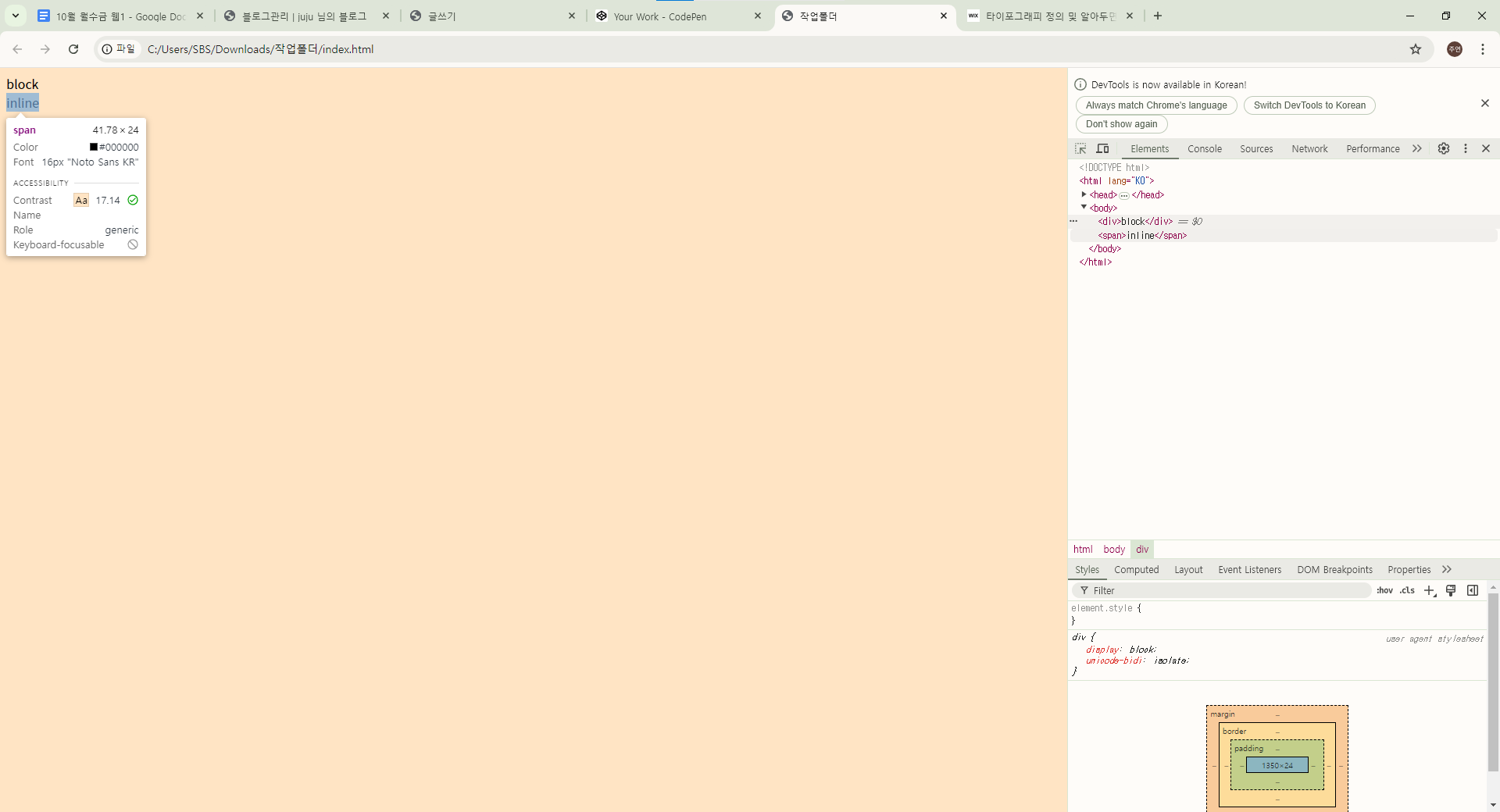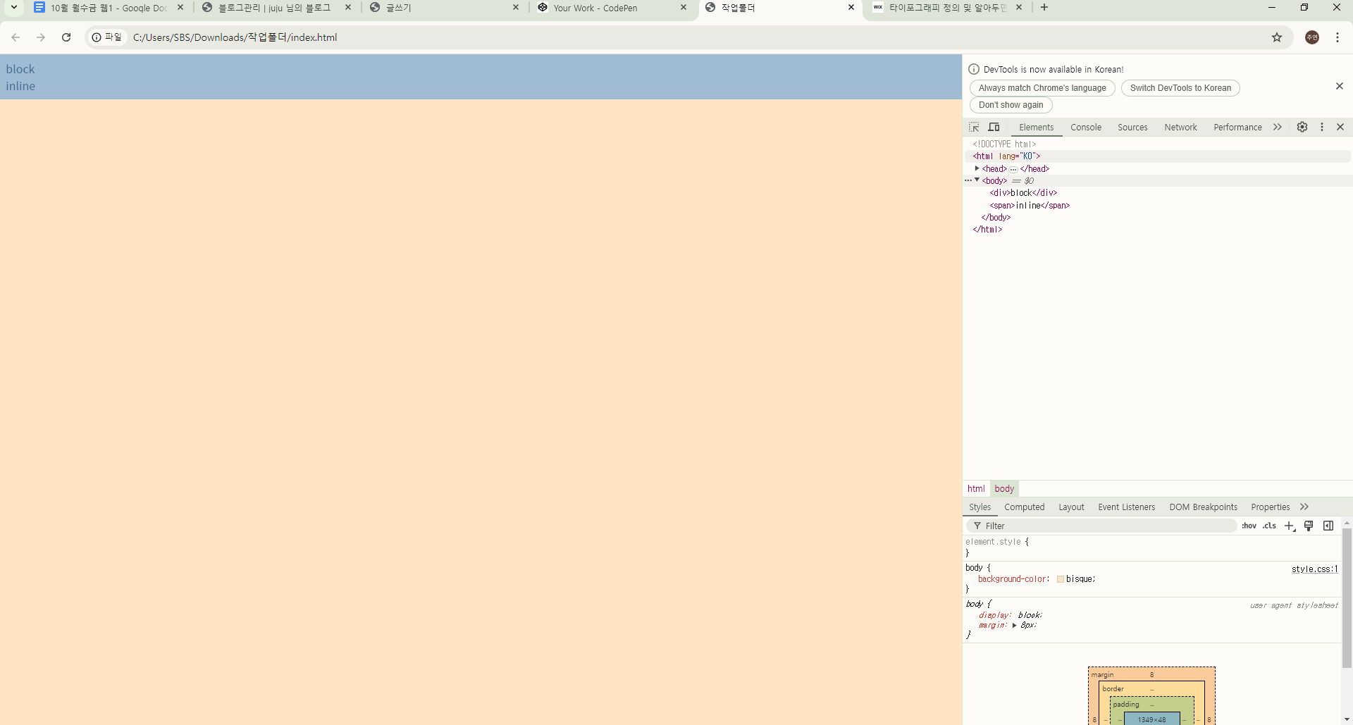 - 한 줄에 하나씩 나옴!!! / 바로 위의 태그 상속(무슨 일이 있어도)